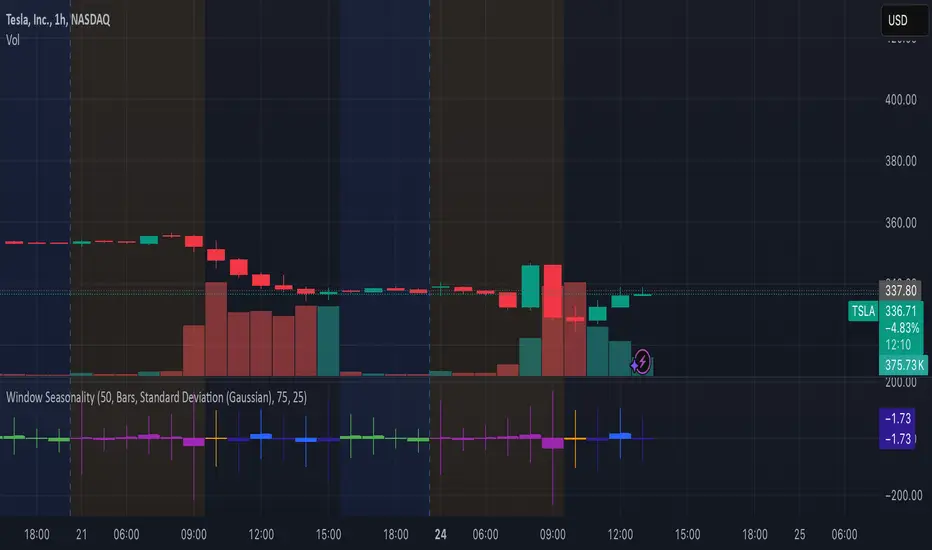 Please be aware, this indicator does not use rigorous statistical methodology and does not imply predictive power. You'll notice the range bands are very wide. Do not trade solely based on this indicator! Certain time windows, such as weekly and monthly, will make more sense applied to commodities, where annual cycles play a role in its supply and demand dynamics. Hourly windows are more useful in looking at equities markets. I like to look at equities with 1-hr windows to see if there is some pattern to overnight behavior or for market open and close.