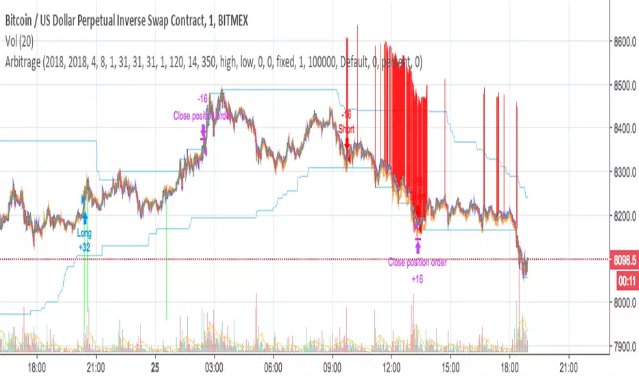 Arbitrage strategy based on different price between exchange. The best time frames 1m, 3m, 5m leverage up to 4. I use the script with more sensitive settings for trading with own robot development. Only for bitmex XBT/USD and rebate will be as bonus 0.025.