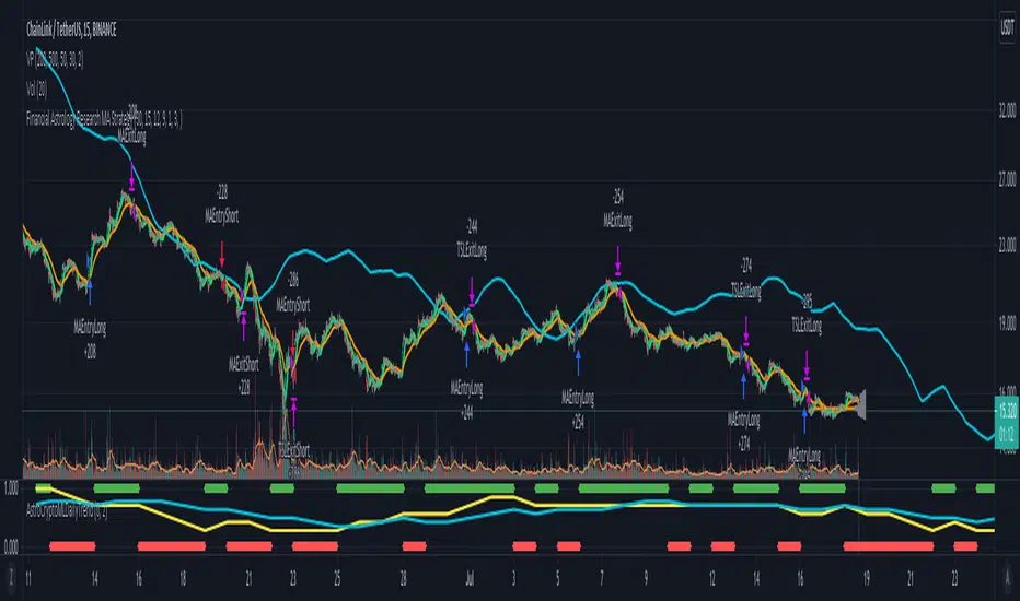 This strategy is based on financial astrology cycles for each asset detected with advanced machine learning techniques, the strategy portfolio includes the crypto-currencies: ADA, BAT, BNB, BTC, DASH, EOS, ETC, ETH, LINK, LTC, XLM, XRP, ZEC and ZRX. The daily price trend is forecasted through this planets cycles (aspects, declination and speed phases), the combination of all this cycles produce a daily price trend prediction that is encoded into a PineScript array using binary format "0 or 1" that represent short and long daily trend respectively.Combining the daily trend with MAs crossover is possible to find very good trade opportunities, the average monthly accuracy of the astro cycles models is 57%-60%, this means that from 30 average days in a month usually 60% of the daily price trend predictions will be correct except in the months when cycles are out of phase. Usually the cycle re-align in few weeks due the fact that Moon, Mercury, Venus and Sun are the more repetitive cycles that tend to dominate the human emotions so only when slow planets cycles interferes with fast cycles the accuracy will be affected.