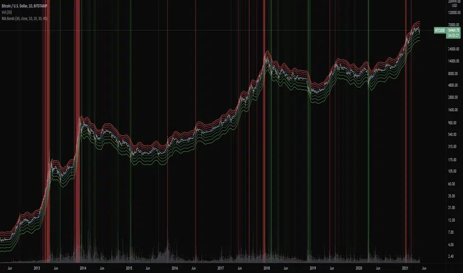 Use this script to find buy and sell zones for BTC based on momentum of the move relative to the average asset price over a given period. The script plots a series of offset bands above and below the Simple Moving Average. When price crosses another band further from the SMA, the background is rendered brighter. The brighter the background, the stronger the buy and sell signal is, as the expectation is that price wants to return to the SMA. Settings are adjustable to fine tune to various time frames and assets. Good settings for BTC Daily are length 30, layers at 10, 20, 30, and 40.