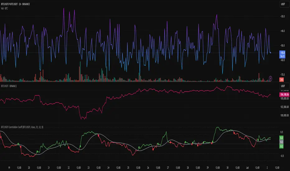 The BTCUSDT Correlation Coefficient indicator measures the strength and direction of the relationship between the selected asset (e.g., a stock or altcoin) and the price of BTCUSDT over a chosen time period. It uses a custom correlation function to calculate how closely the asset's price movements align with Bitcoin, returning a value between -1 and +1. A coefficient near +1 indicates strong positive correlation, while values near -1 indicate inverse correlation. This helps traders assess whether the asset tends to follow Bitcoin’s price trends or behave independently, enabling more informed decisions on portfolio diversification and market sentiment alignment.