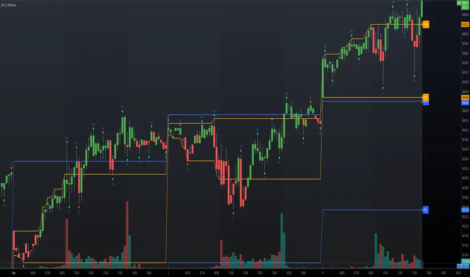 The “Top-Down Trend and Key Levels with Swing Points” indicator is a comprehensive tool designed to enhance your technical analysis by integrating multiple trading concepts into a single, easy-to-use script. It combines higher timeframe trend analysis, key price levels, swing point detection, and ranging market identification to provide a holistic view of market conditions. This indicator is particularly useful for traders who employ multi-timeframe analysis, support and resistance levels, and price action strategies.