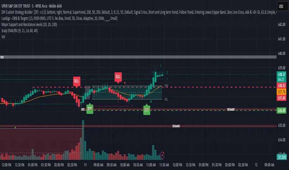 Buy and Sell Signals. Use with Supply and Demand to find good entries. Do not rely solely on this signal. Monitors with short and long EMA cross along with oversold or overbought RSI.