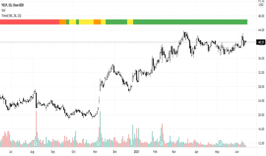 Green = Up Trend = Last Bar is at least 15% greater than the bar six months ago