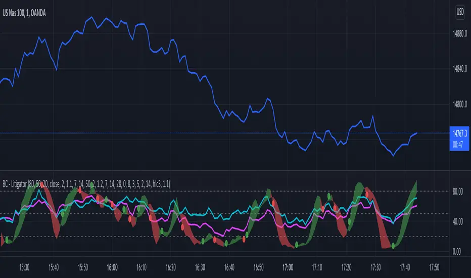 The Litigator is an indicator that encapsulates the value delivered by the Relative Strength Index, Ultimate Oscillator, Stochastic and Money Flow Index algorithms to produce signals enabling users to enter positions in ideal market conditions. The Litigator integrates the value delivered by the above four algorithms into one script.