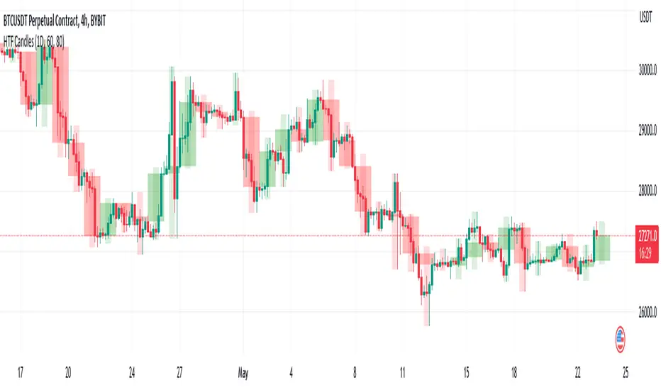 This draws candlesticks from higher time frames on the current chart. I tried to keep the script simple using some newly introduced Pine capabilities.