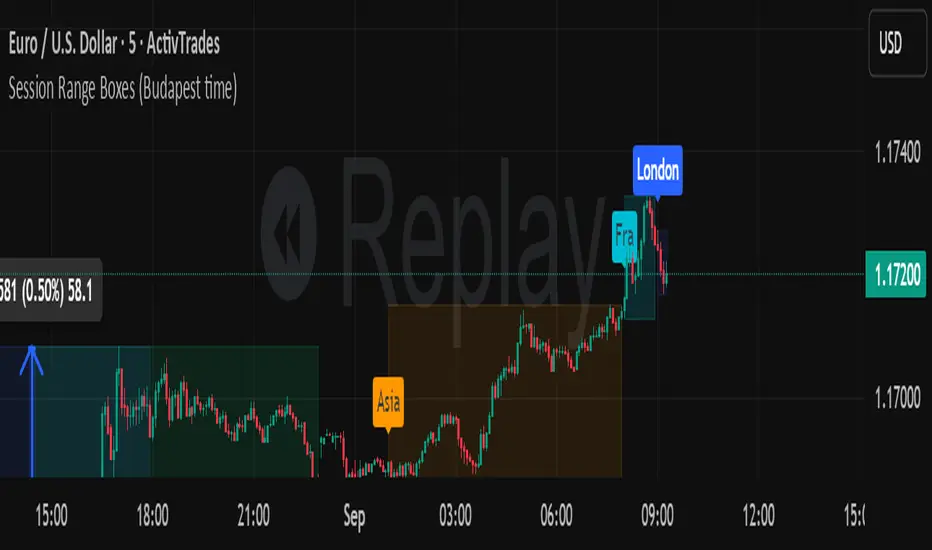 This indicator draws intraday range boxes for the main Forex sessions based on Europe/Budapest time (CET/CEST).