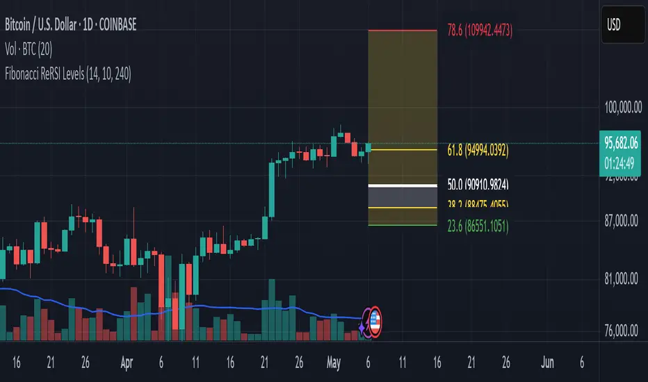 Fibonacci RSI Levels: Plots five key levels—23.6% (Oversold), 38.2% (Downtrend Limit), 50.0% (Mid Level), 61.8% (Uptrend Limit), and 78.6% (Overbought)—based on a logarithmic RSI calculation.