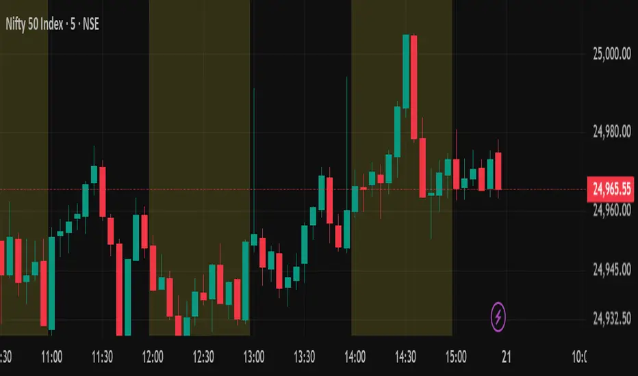 This indicator automatically highlights every alternate one-hour window on your chart, making it easy to visually identify and separate each trading hour. The background alternates color every hour, helping traders spot hourly cycles, session changes, or develop time-based trading strategies.