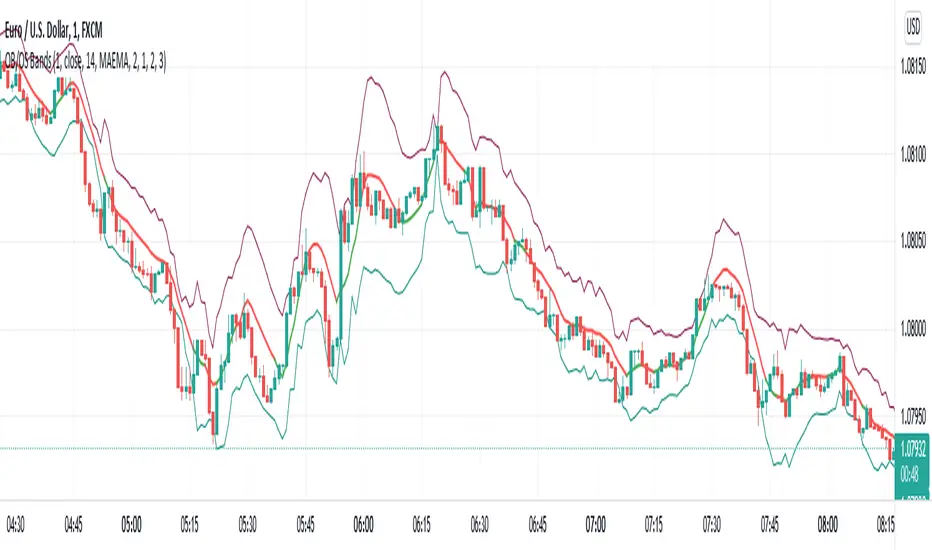 The basis of this script is my "Hybrid Overbought/Oversold Detector" which uses many different oscillators to confirm overbought/oversold conditions. The main idea is to generate higher and lower bands around the desired moving average using an average of the volatility (ATR) and the standard deviation (StDev), of course by interfering detected overbought/oversold condition.