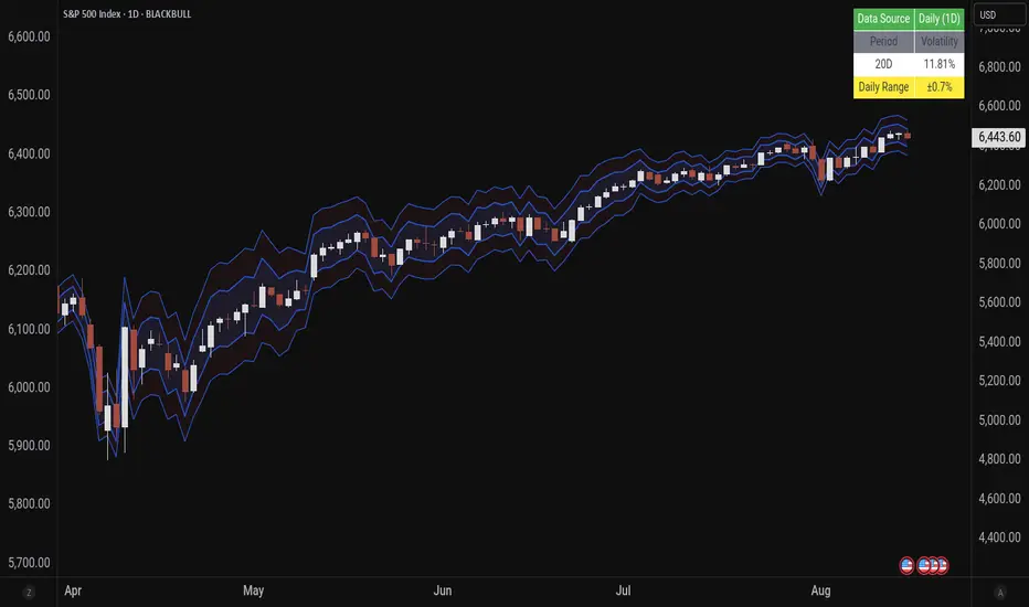 The Rolling Volatility Bands indicator provides a statistically-driven approach to visualizing expected daily price movements using true volatility calculations employed by professional options traders. Unlike traditional Bollinger Bands which use price standard deviation around a moving average, this indicator calculates actual daily volatility from log returns over customizable rolling periods (20-day and 60-day), then annualizes the volatility using the standard √252 formula before projecting forward-looking probability bands. The 1 Standard Deviation bands represent a ~68% probability zone where price is expected to trade the following day, while the 2 Standard Deviation bands capture ~95% of expected movements. This methodology mirrors how major exchanges calculate expected moves for earnings and FOMC events, making it invaluable for options strategies like iron condors during low-volatility periods (narrow bands) or directional plays when volatility expands. The indicator works on any timeframe while always utilizing daily candle data via security() calls, ensuring consistent volatility calculations regardless of your chart resolution, and includes real-time annualized volatility percentages plus daily expected range statistics for comprehensive market analysis.