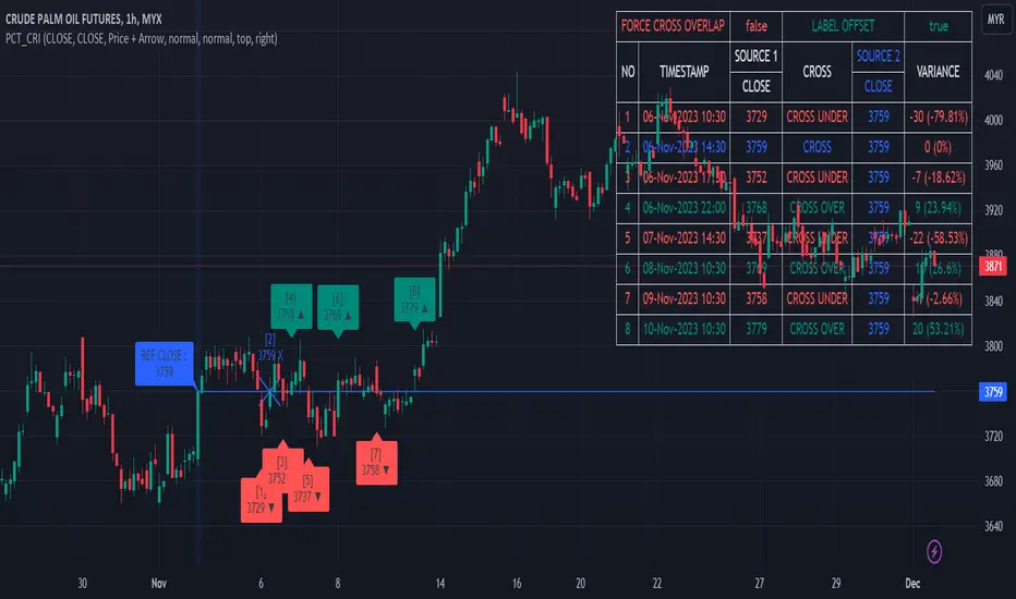 8. Source 2 is drawn as straight line, while Source 1 will draw as label either above line for crossover, below line for crossunder and marked 'X' if crossing with Source 2's line.