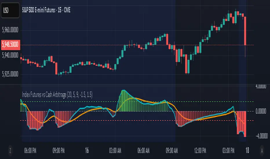 This indicator measures the statistical spread between major stock index futures and their corresponding cash indices (e.g., ES vs SPX, NQ vs NDX) using Z-score normalization. It automatically detects commonly traded index pairs (S&P 500, Nasdaq, Dow Jones, Russell 2000) and calculates a smoothed spread between futures and spot prices. A Z-score is then derived from this spread to highlight potential overpricing or underpricing conditions.