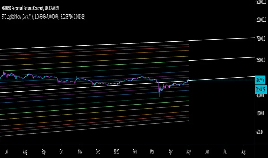 The rainbow above the Zero Line are the Fibonacci multiples from 0 --> 1 of the log regression (0.236, 0.382, etc.)