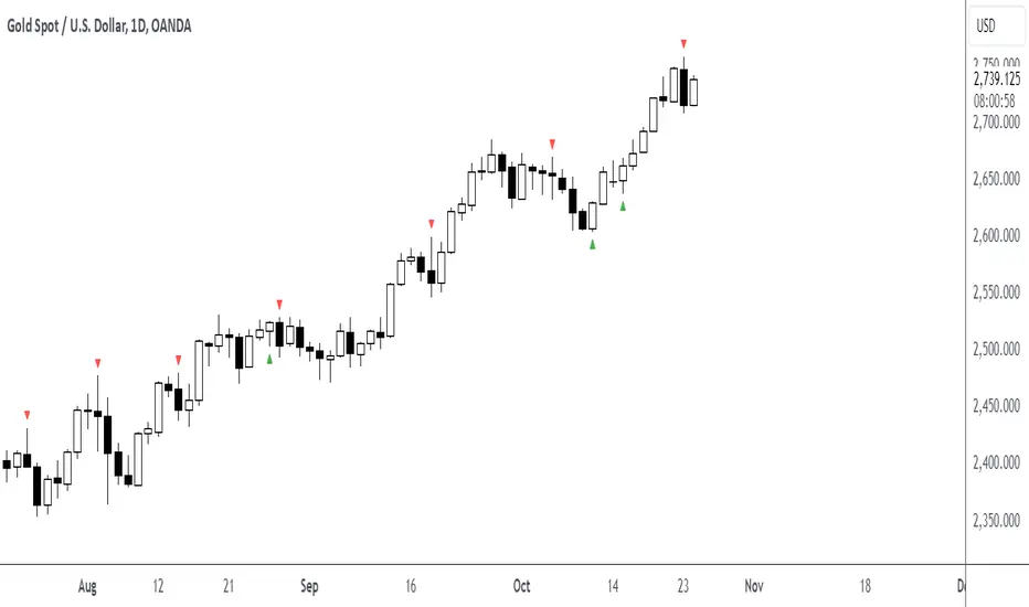- Displays visual markers: green triangles for bullish patterns, red triangles for bearish patterns