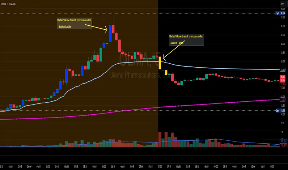 As each new bar forms, the script checks whether its volume exceeds every prior bar. When a new volume peak appears, that candle is marked (blue for bullish, yellow for bearish), making it easy to spot where momentum, participation, or exhaustion reached a new extreme.
