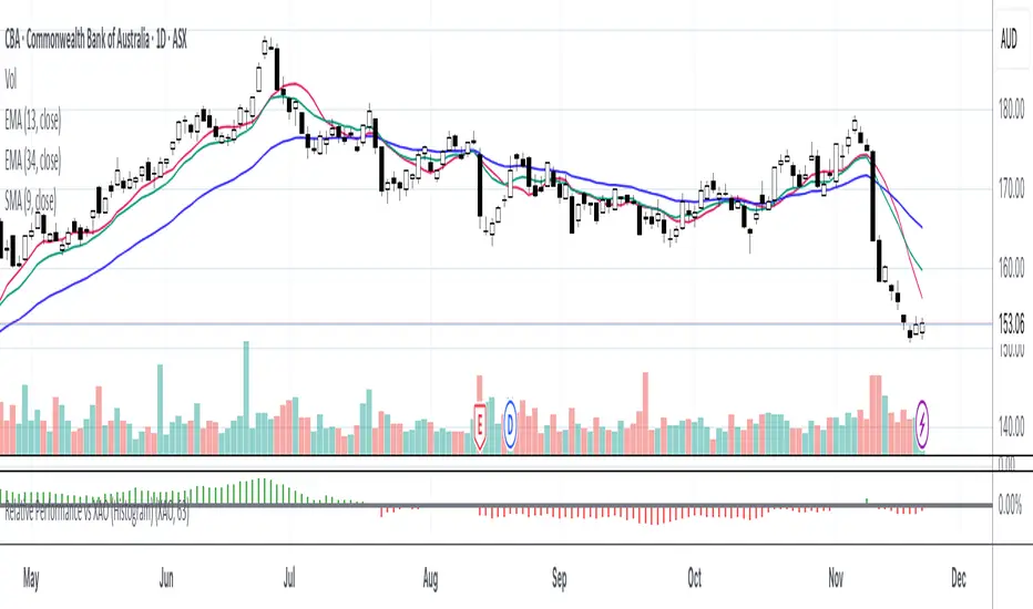 RSC Relative Strength Comparison is used to compare performance of a Sector Index or Stock against a Benchmark (Index). The Benchmark used is the Australian All Ordinaries Index with a look back period of 63 days (3 months). Both the benchmark and look back period may be changed in the code to suit.