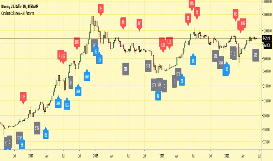 Here I have collated all of the in-built TradingView candlestick patterns into one indicator.