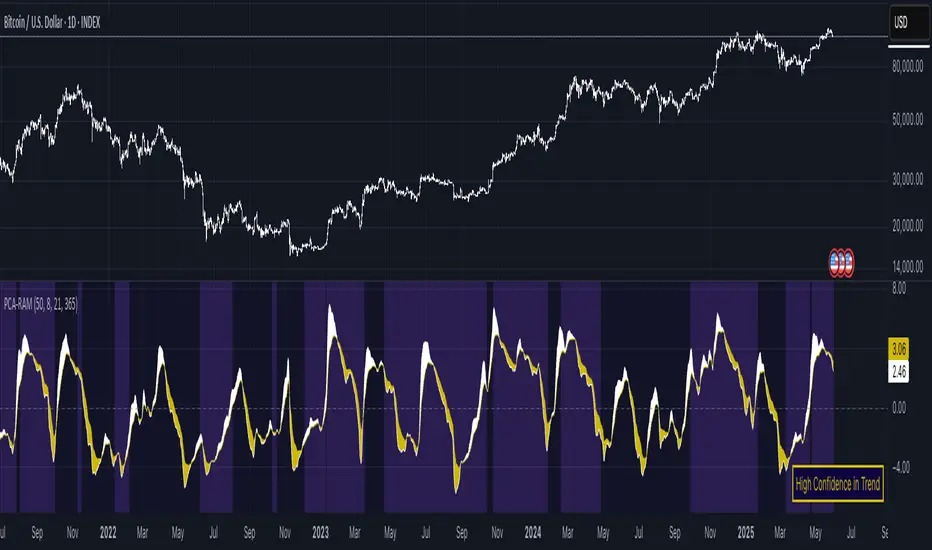 SummaryThe PCA Regime-Adjusted Momentum (PCA-RAM) is an advanced market analysis tool designed to provide nuanced insights into market momentum and structural stability. It moves beyond traditional indicators by using Principal Component Analysis (PCA) to deconstruct market data into its most essential patterns.