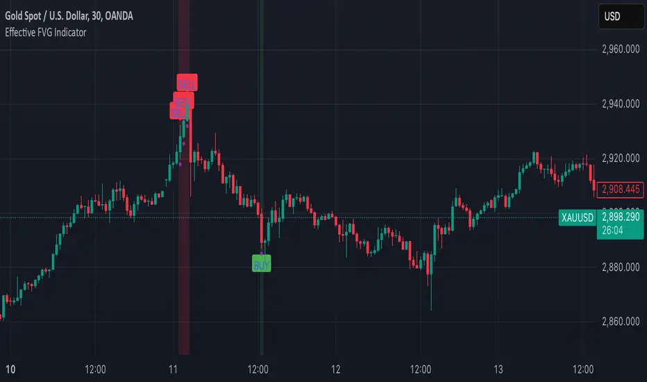 Buy/Sell Signals : Marks bullish FVGs with a green "BUY" label below the bar and bearish FVGs with a red "SELL" label above the bar.