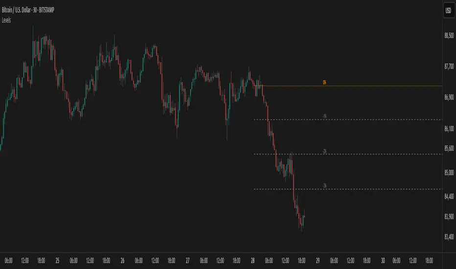 This indicator plots horizontal levels based on a percentage change from the previous day's close (or open, if selected). It allows traders to visualize price movements relative to meaningful thresholds like ±1%, ±2%, etc.