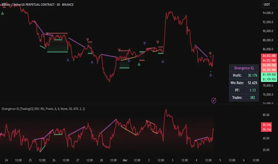 Divergence IQ lets traders identify divergences between price action and almost ANY TradingView technical indicator. This tool is designed to help you spot potential trend reversals and continuation patterns with a range of configurable features.