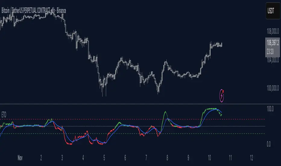 The core innovation of ETO is its dynamic volatility adjustment mechanism. The indicator calculates an ATR percentile rank over a lookback period and uses this to scale the momentum readings. When volatility is elevated, the indicator becomes less sensitive to price moves, recognizing that larger displacements are normal in volatile conditions. Conversely, in low volatility environments, smaller price moves are given more weight. This prevents false signals during volatility expansions and maintains sensitivity during quiet periods.