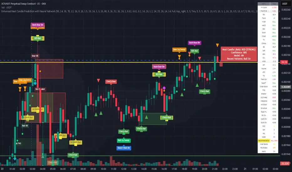 This advanced all-in-one indicator combines machine learning-based next candle direction prediction with comprehensive Smart Money Concepts (SMC/ICT) tools, classic technical indicators, and visual aids for price action traders. It predicts whether the next candle will close bullish (green), bearish (red), or neutral — with a confidence percentage — using either a logistic regression neural network approximation (pre-trained on historical data) or a rule-based decision tree ensemble.