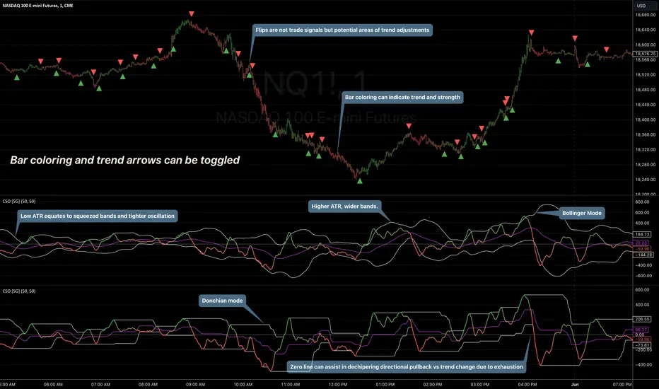 There are two modes of display for the strength trend to show potential exhaustion on either side, bollinger bands and donchian channels. Each has their own pros and cons but as most are familiar with bollinger bands this is the default.