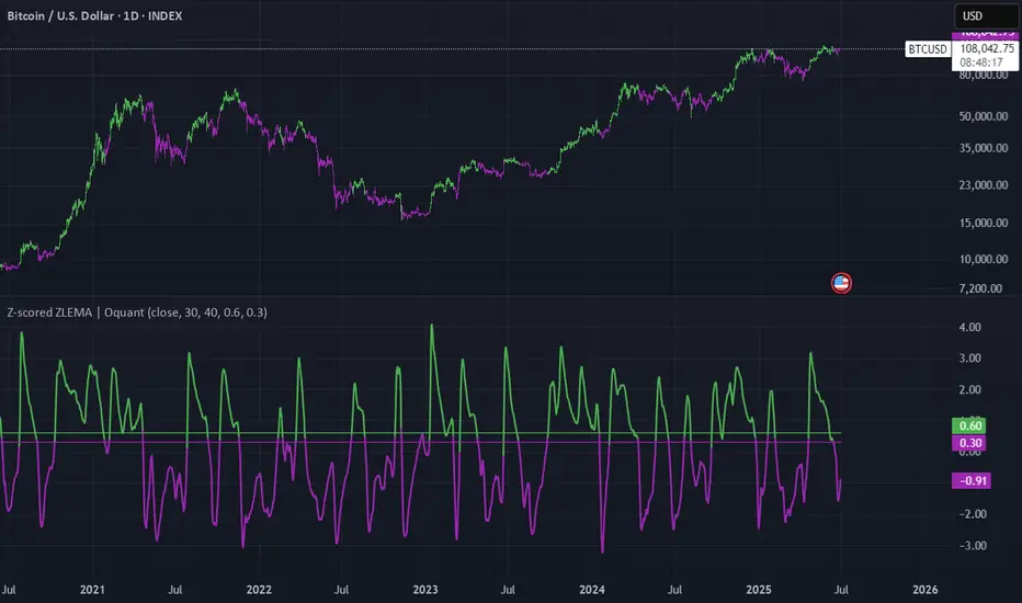 Once ZLEMA is calculated, the indicator applies Z-score normalization to measure how far the current ZLEMA value is from its mean. The Z-score expresses this difference in terms of standard deviations, creating a clear, standardized scale. This helps highlight when price moves are unusually strong—either up or down—beyond normal fluctuations.