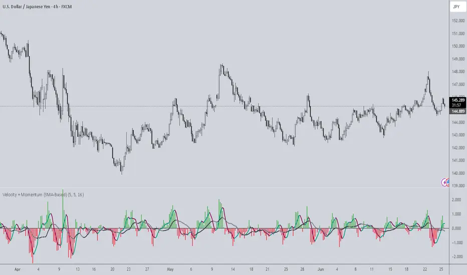 Velocity + Momentum (SMA-Based) is a clean, powerful oscillator that measures price acceleration using SMA-derived velocity and dual momentum signals. This tool is ideal for identifying directional shifts, exhaustion points, and early entries across any market or timeframe.