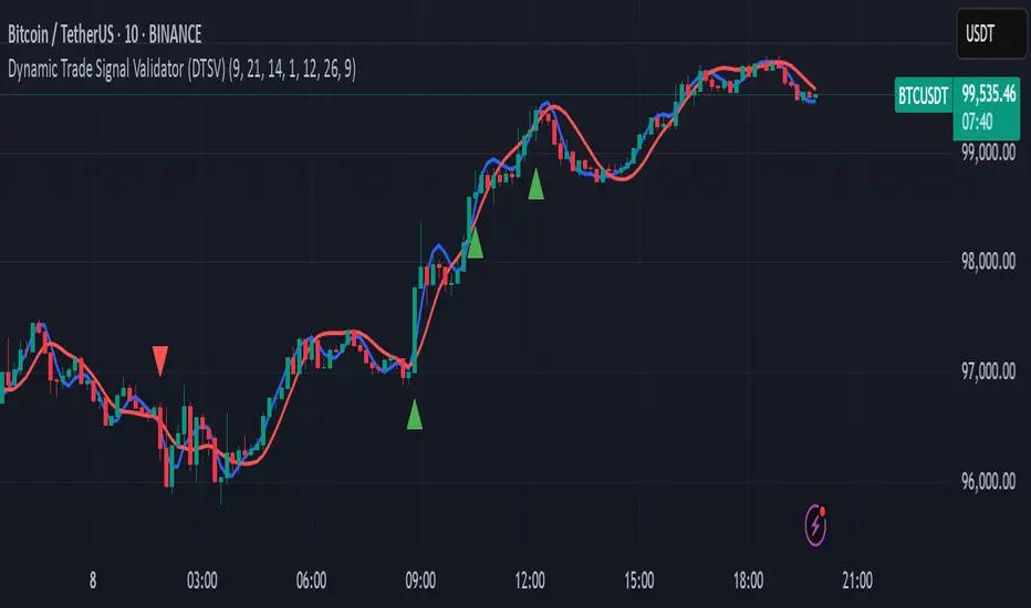 The Dynamic Trade Signal Validator (DTSV) is designed to filter false trade signals while generating reliable, frequent trade opportunities. False signals, which lead to unprofitable trades, often occur in choppy or low-momentum markets. The DTSV combines Hull Moving Average (HMA) crossovers, Average True Range (ATR) breakout confirmation, and MACD histogram momentum filtering to ensure signals align with trend, volatility, and momentum, making it ideal for day trading or swing trading across assets like stocks, forex, or cryptocurrencies.