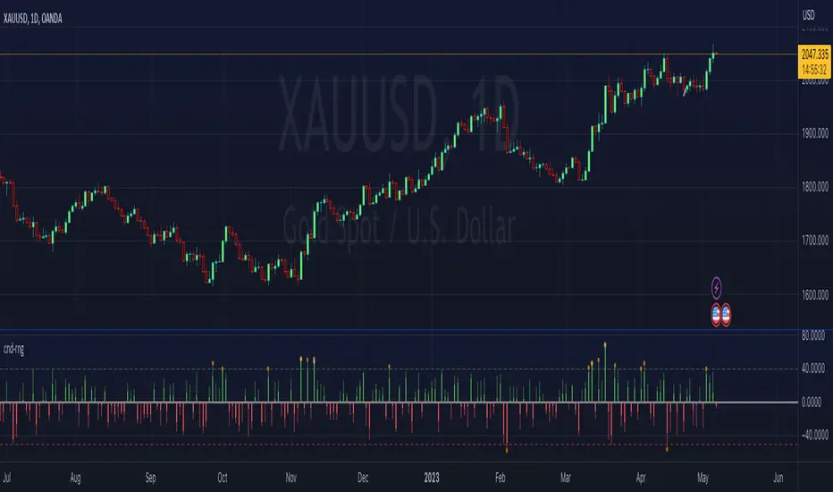 Threshold horizontal lines are plotted, so the trader can modify these high and low levels as needed through the user interface. These need to be configured to match the instrument's price range levels for the timeframe. The defaults are pretty arbitrary for +/- 0.0080 (80 pips in a 4-decimal place forex pair). Where a range reaches or exceeds a threshold, it's visually marked as well with a shape at the Body or Candle peak, to assist with quicker visual potential setup scanning, for example, to anticipate a following reversal or continuation.