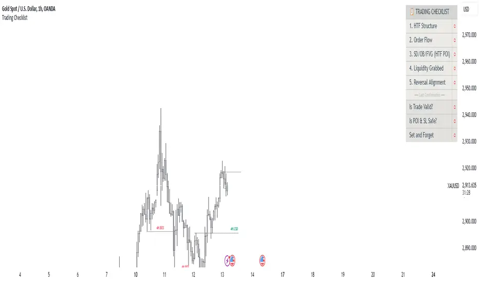 A clean and efficient visual checklist to maintain trading discipline and consistency. This indicator helps traders follow their trading plan systematically by providing an easy-to-use checklist of key confirmation points.