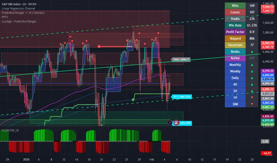 With automated TP/SL calculations, real-time backtesting stats (win rate, profit factor, skipped signals), multi-timeframe trend dashboard, volume filters, EMA trend alignment, and intelligent same-bar fill resolution, Predictive Ranges replaces 5+ separate indicators while providing institutional-grade risk management and performance tracking.