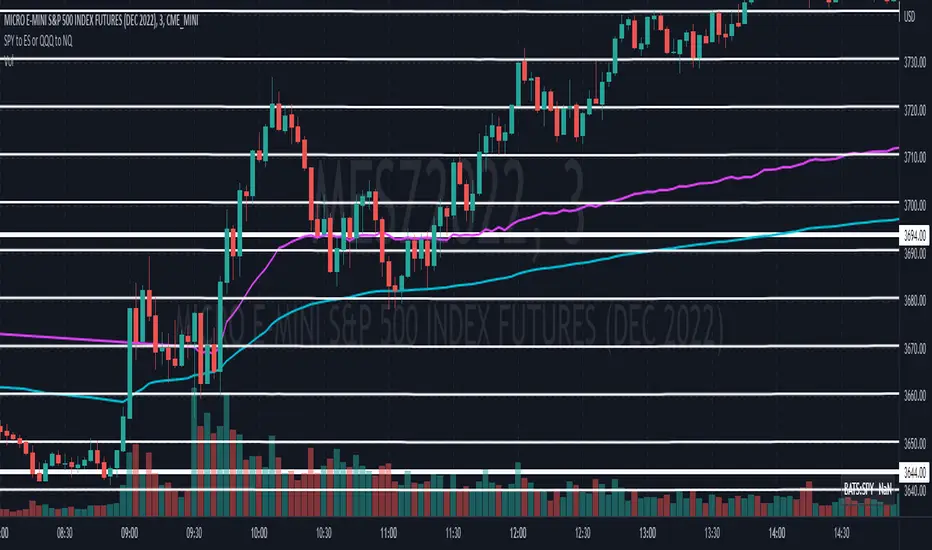 This indicator is used to automatically map an ETF's VWAP and 10 levels above and below the strike of your choice, to the futures or index instrument currently being viewed/traded. This works very well when using both SPY to ES/MES/SPX or QQQ to NQ/MNQ/NDX to plot the ETF strikes and can lead to some incredible trades, especially when trading level to level. Since SPY, QQQ, IWM, and DIA have the same price action as their futures iteration, there seems to be a direct correlation between their levels and VWAP . This indicator is made to easily map these key levels to the appropriate futures instrument. If you have a way to measure GEX centered around a certain level, I recommend color coding the lines to help indicate whether the level will have strong positive or negative gamma hedging associated with it.