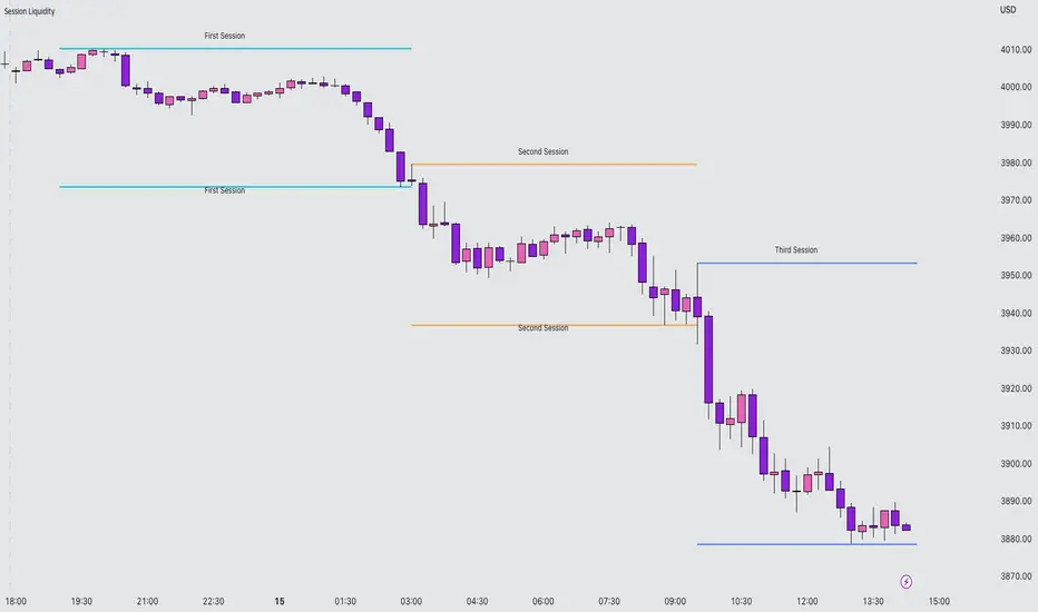 The “Session Liquidity” TradingView indicator by Infinity Trading creates dynamic horizontal lines at the high and low points of a specified time span within the trading day. This indicator gives the user control of three separate time spans so the user can dynamically see the highs and lows of their favorite daily time spans.