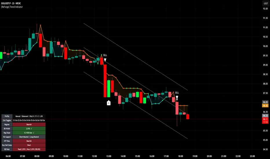 The ReForge Trend Indicator is a closed-source adaptive regime model designed to identify structural trend transitions using a hybrid volatility boundary and state-based persistence logic.