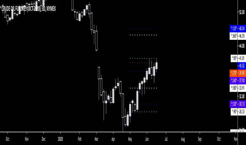 This script uses the last hlc3 value of 1H, 4H, D and/or W and rotates it 360º up/down with four increments of 90º to find out potential support and resistance areas. Can be used as a dynamic support & resistance tool or just to gauge how overbought/oversold the market is. Special thanks to @Nv56 for his assistance in writing this script.