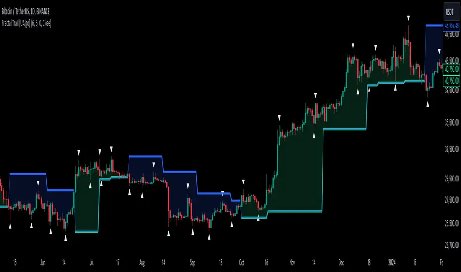 The Fractal Trail [UAlgo] is designed to identify and utilize Williams fractals as dynamic trailing stops. This tool serves traders by marking key fractal points on the chart and leveraging them to create adaptive stop-loss trails, enhancing risk management and trade decision-making.