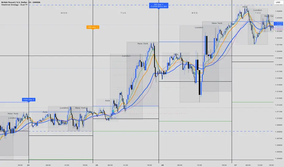 The Madstrat Strategy indicator is a comprehensive forex trading system that identifies high-probability trade setups based on a day-counting methodology combined with multi-timeframe EMA alignment analysis. It generates two primary signal types:
