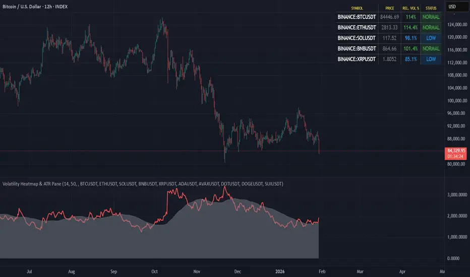 This indicator provides a comprehensive view of multi-symbol volatility, displaying a dynamic heatmap table and a synchronized ATR (Average True Range) panel. It is designed to help traders identify periods of abnormal market activity or "volatility squeezes" across multiple assets simultaneously.