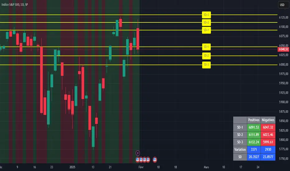 This indicator calculates and displays the daily variation of an asset (open/close and high/low spread), as well as probability levels based on the standard deviations (SD) of past variations. It provides a clear view of daily trends and the probability levels for the day's volatility.