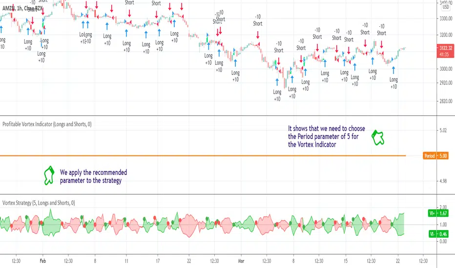 This tool is a performance scanner that uses a decision tree-based algorithm under the hood to find the most profitable period's setting for the indicator. It analyzes the range of periods between 2 to 100 and backtests the Vortex Indicator for each period using the strategy mentioned above across the entire history of an instrument.