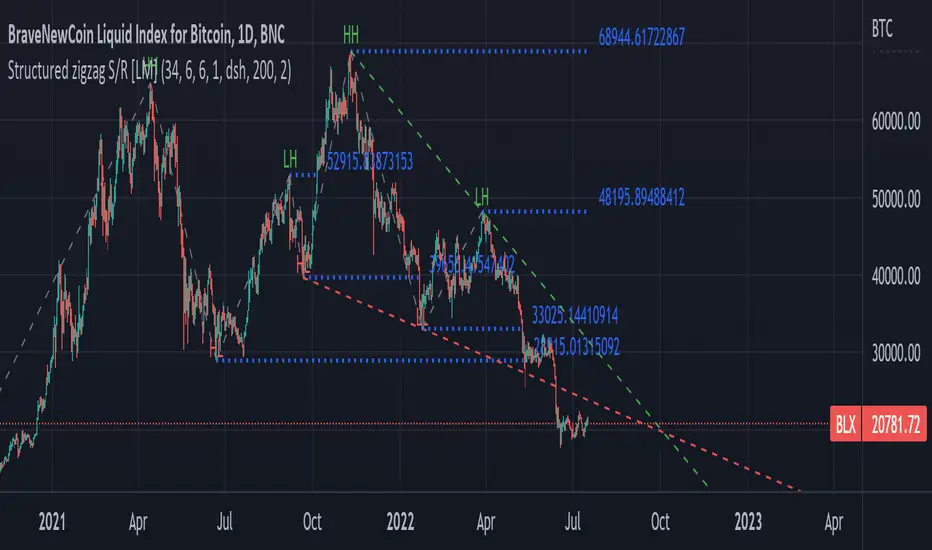 I would like to introduce you Structured zigzag support&resistance. It is based on the ZigZag semafor script made by DevLucem so shout out to him