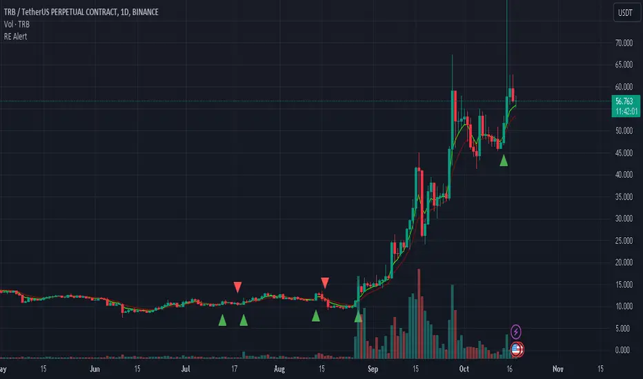 This script plots green and red triangles below and above the price bars to indicate long and short alert conditions, respectively. It also triggers alerts when these conditions are met.