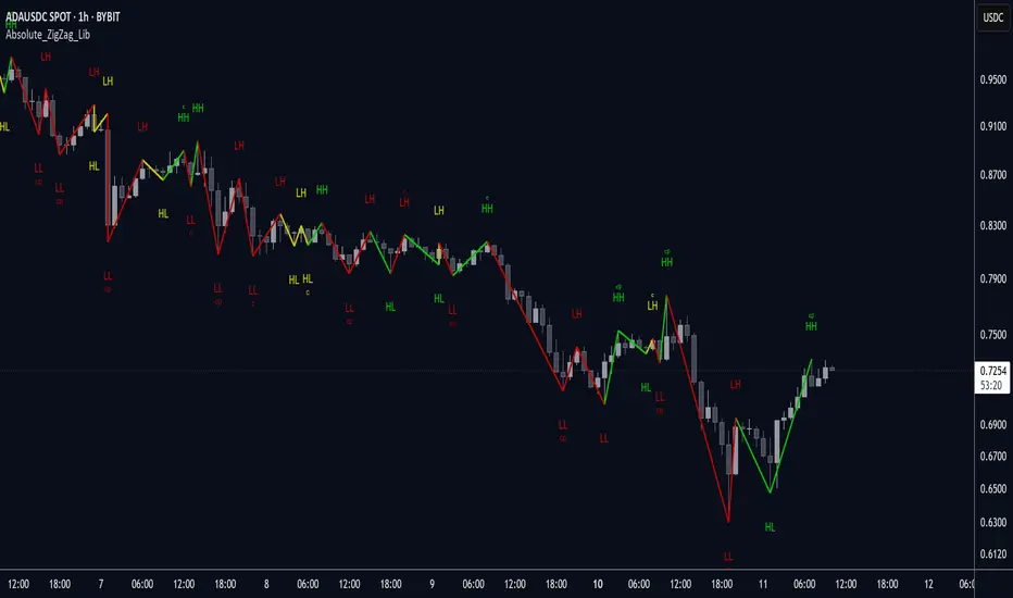 This ZigZag Library is a Bit different. Instead of using percentages or looking more than 1 bar left or right, this Zigzag library calculates pivots by just looking at the current bar highs and lows and the ones of one bar earlier.