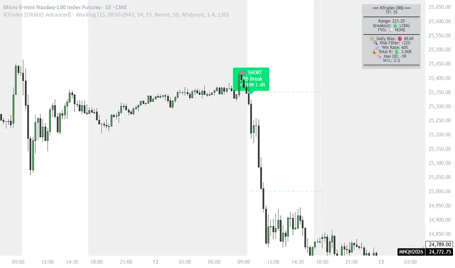 NTrades [ORBDD Advanced] – Opening Range Breakout System is a complete intraday Opening Range Breakout (ORB) trading indicator that automatically defines the New York opening range, identifies breakout or retest entries, and applies strict rule-based filters to improve trade quality. It includes optional volume confirmation, Fair Value Gap (FVG) confluence, EMA trend filtering, and a strict daily bias filter to align trades with higher-timeframe direction. The system features advanced risk management with customizable stop-loss placement, adjustable risk-to-reward ratios, maximum risk filtering, time-based trade restrictions, and automatic force exits. It also tracks performance in real time with a built-in dashboard displaying win rate, total R captured, drawdown, and win/loss statistics—making it a structured, data-driven ORB solution for disciplined intraday traders.