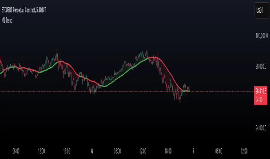 The kNN Trend Predictor is a machine learning-based indicator that uses the k-Nearest Neighbors (kNN) algorithm for price prediction in trading. By analyzing historical price movements and computing Euclidean distances, the script identifies the closest past price patterns and forecasts potential trends. It provides color-coded trend signals, optional trade entry labels, and alerts for long and short signals.