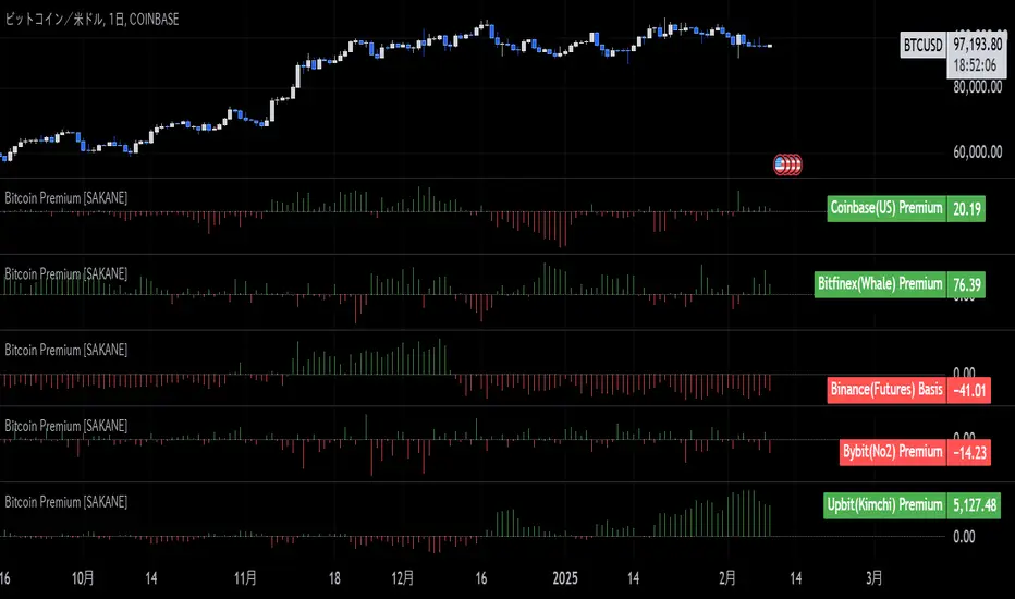 "Bitcoin Premium [SAKANE]" is an indicator designed to analyze the price differences (premiums) of Bitcoin between major exchanges. By using this tool, you can visualize these differences and trends across exchanges, helping you make more informed trading decisions.